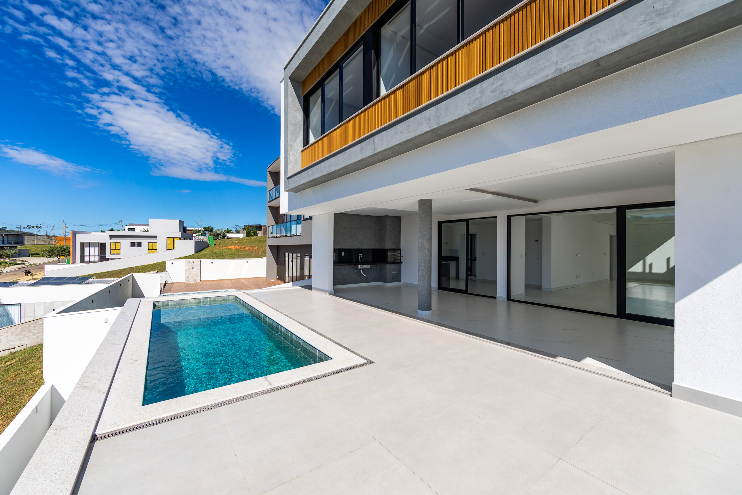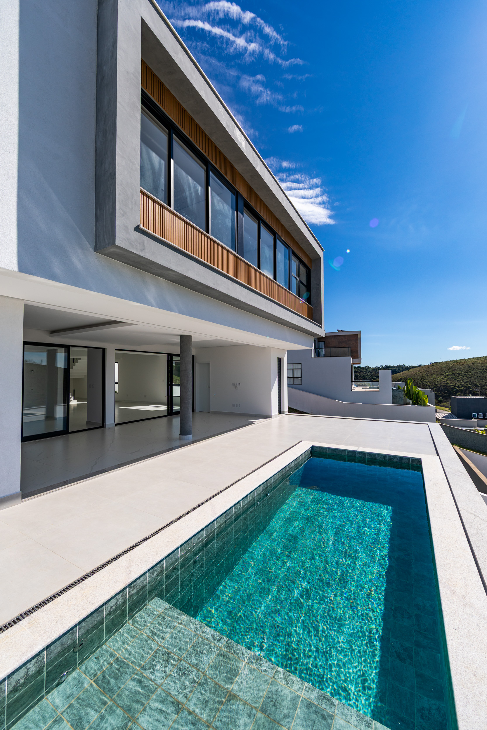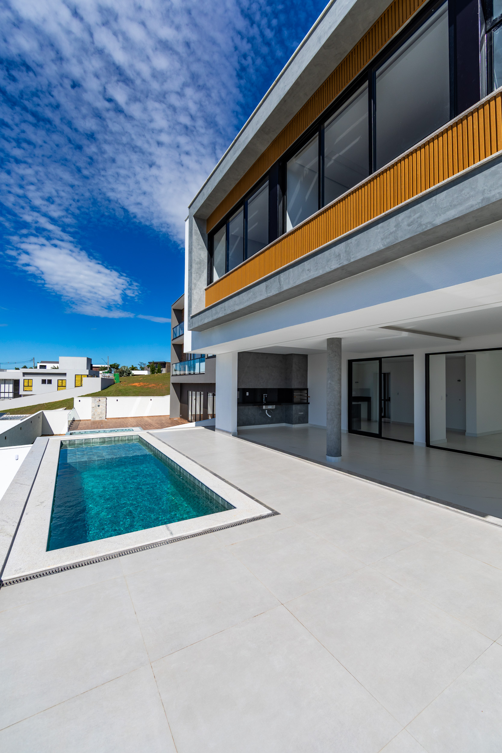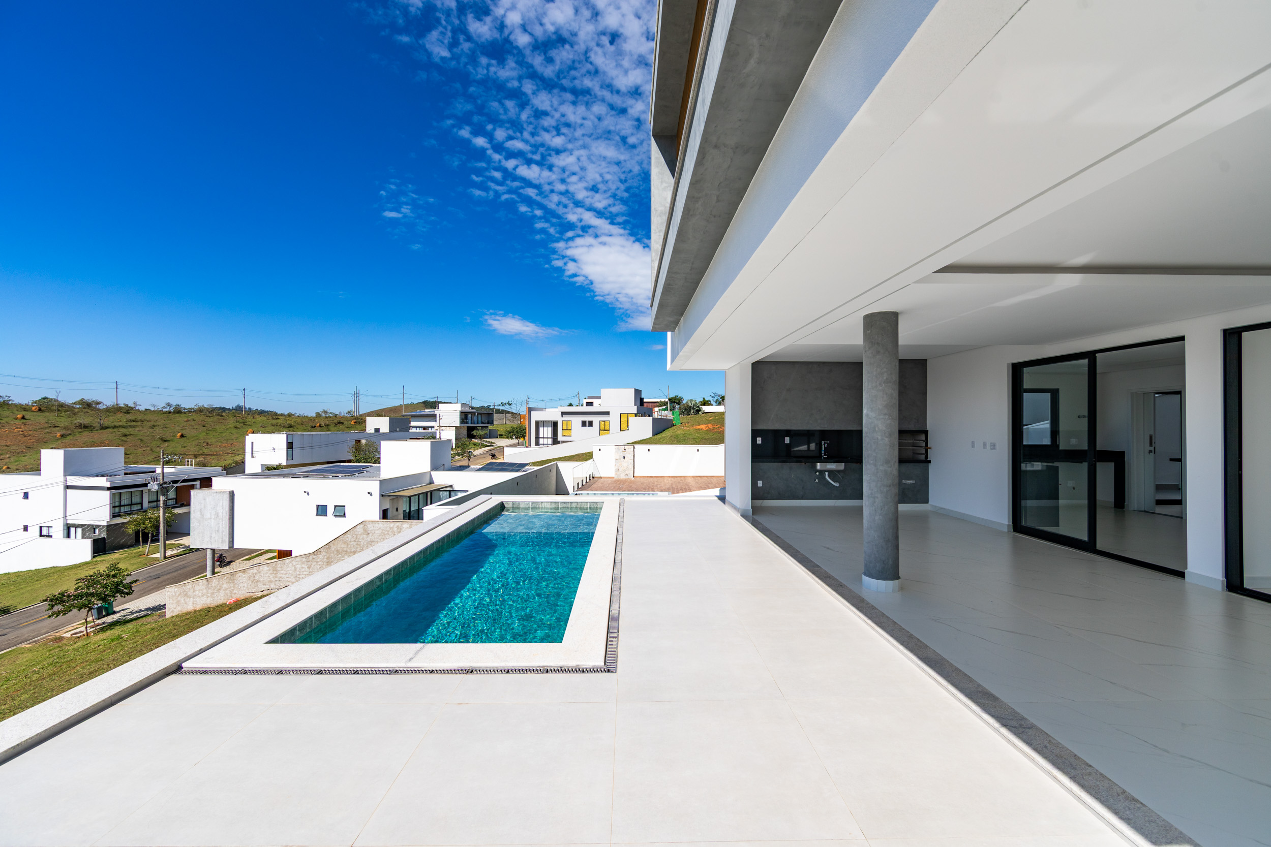 Assinada pelo arquiteto Marcelo Amoroso, a casa é arquitetonicamente moderna e atemporal. Seu design primoroso valoriza ambientes amplos, iluminados e perfeitamente integrados, unindo beleza, funcionalidade e uma interação impecável com a natureza ao redor.