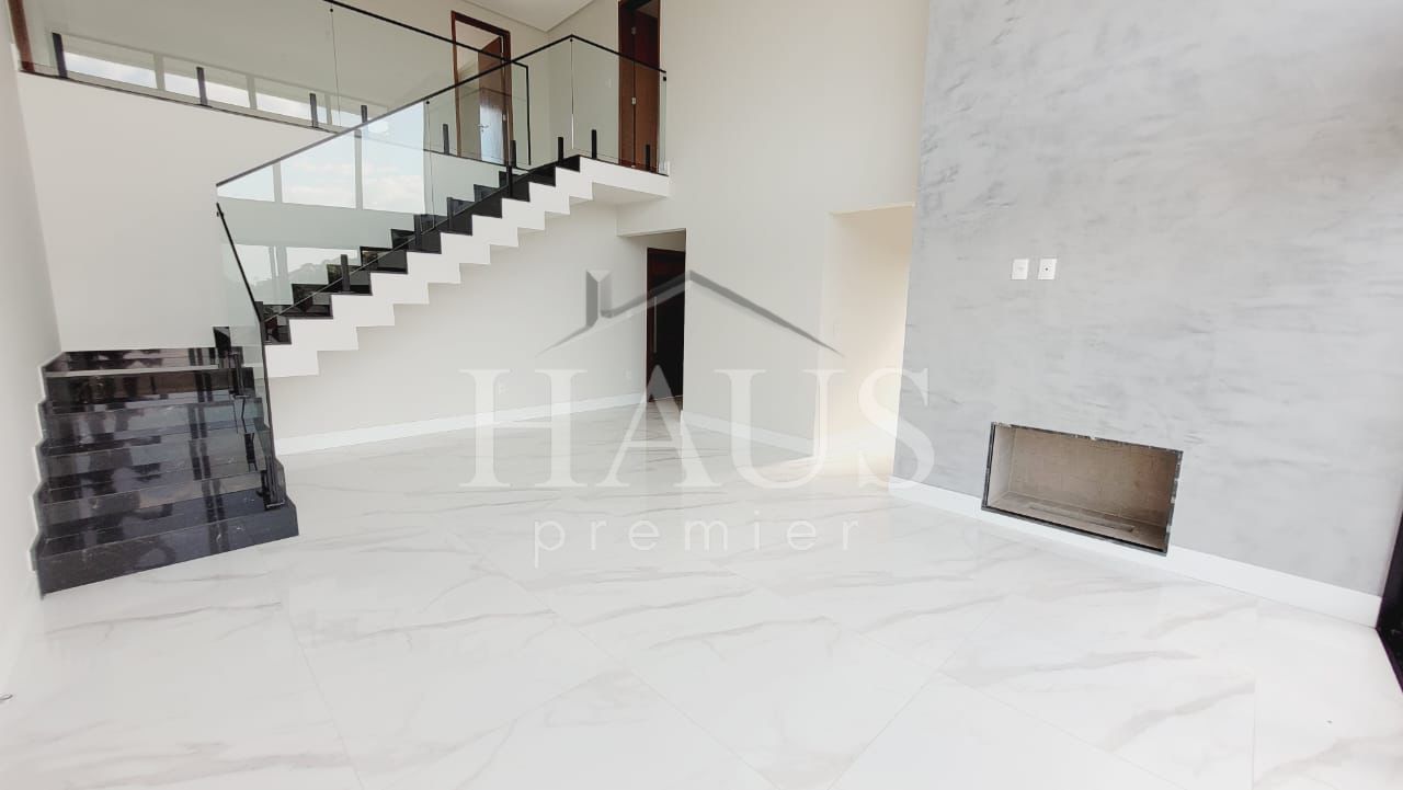 Sala ampla com pé-direito duplo e lareira, integrada por uma deslumbrante parede de vidro que privilegia a iluminação natural.